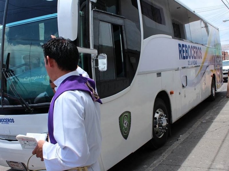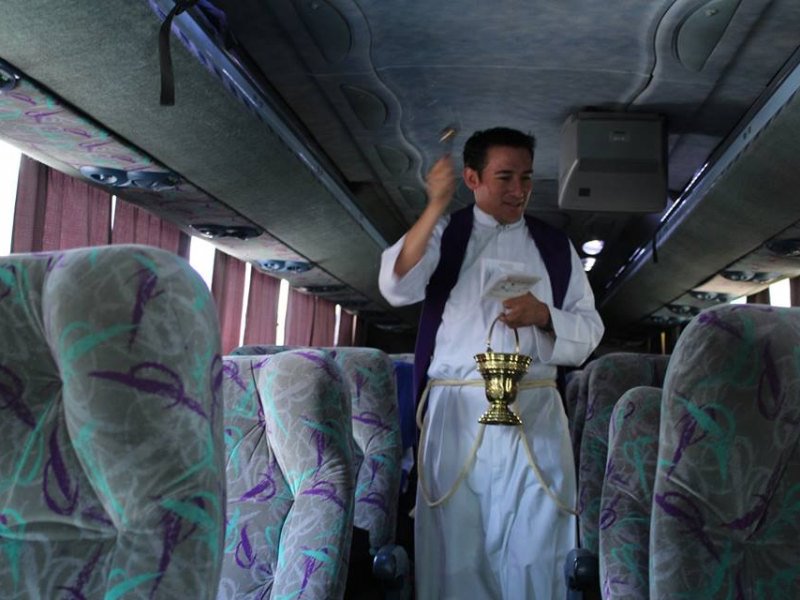 Luego de que el sacerdote Ruíz ofreciera sus intenciones por los ahí presentes, rodeó el autobús y le roseó agua bendita; en el interior hizo lo mismo.