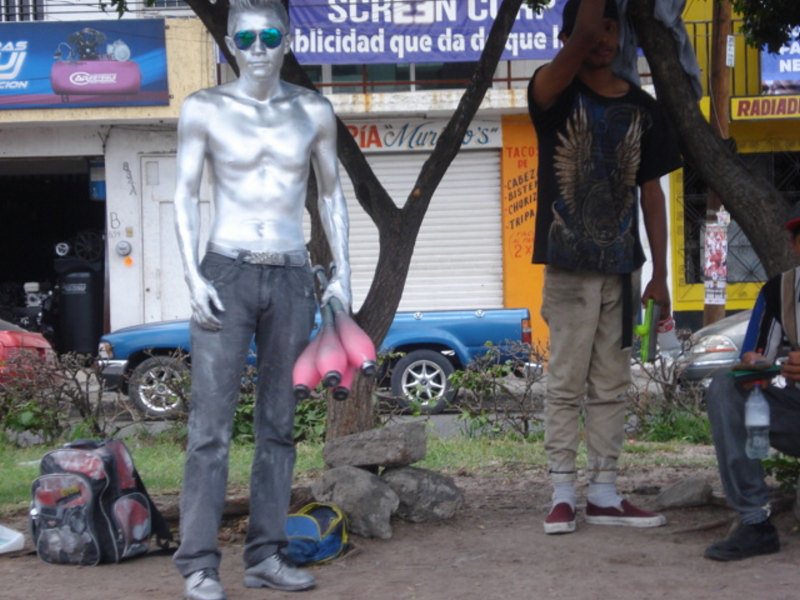 En la foto vemos a un joven que se las ingenia, haciendo malabares y pintado su cuerpo de plateado, para dar la apariencia de “hombre de metal” y así lograr ganarse la voluntad de las personas que circulan por el boulevard y recibir de ellos la aportación económica que cubra sus necesidades.
