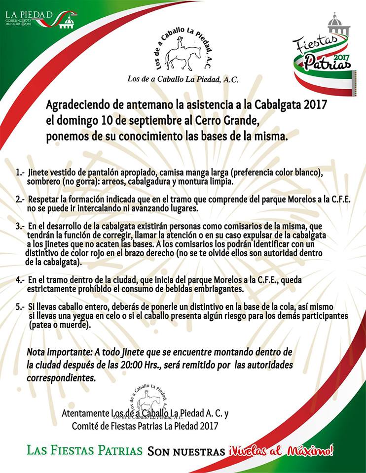 Además de que a todo jinete que se encuentre montando dentro de la ciudad después de las 20:00 horas el día de la cabalgata será remitido a las autoridades correspondientes.