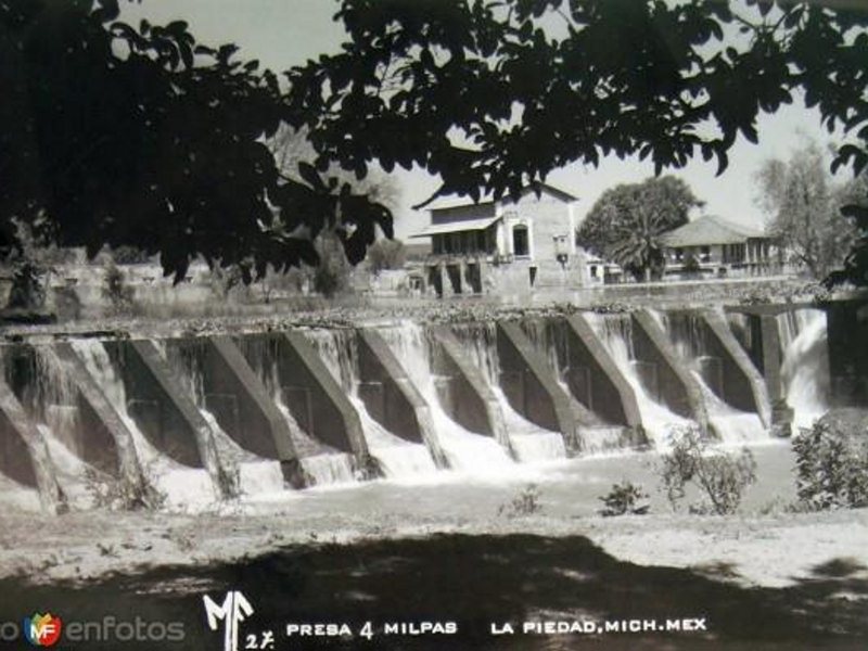 Con enorme gusto saludandoles de nuevo en este nuestro rinconcito de recuerdos mis buenos amigos, solamente para compartir con ustedes esta postal de uno de nuestros rincones más emblemáticos de La Piedad, la presita de las Cuatro Milpas, vista desde el lado de Santa Ana, en las ya mencionadas 4 Milpas, donde se encontraban unos fructíferos guayabos que al tener al pie de sus raíces, las aguas del Lerma, nos daban unas riquízimas y variadas guayabas tanto blancas como rosas.