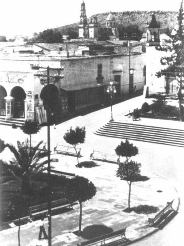 Cómo estamos mis buenos amigos, escribiendo de nueva cuenta para ustedes, y por supuesto, dejandoles nuestra fotografía del día de hoy, la que cuenta con detalles muy sobresalientes, por ejemplo. la inolvidable tienda de don Apolonio Guizar, «El Pollito», en donde se encontraba simple y sencillamente cualquier cosa que fueramos a buscar, los arbolitos apenas creciendo y que actualmente ya maduros, siguen engalanando nuestro hermoso jardín, a la derecha, una pequeña torrecilla, antes de la remodelación del Santuario del Señor de La Piedad, y al fondo, un pocomás a la izquierda, la torre inconclusa de las dos que actualmente engalanan el templo del Santuario donde se venera a nustra Morenita del Tepeyac.