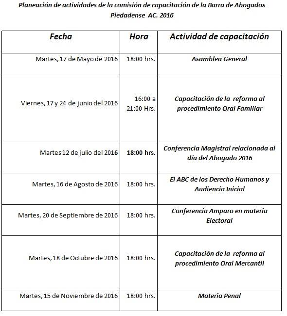 Así mismo se extendieron temas como la instalación del quórum legal, el informe de la Comisión de Capacitación y entrega de propuestas de eventos de Capacitación para el resto del año, propuesta de nuevo formato para la solicitud de ingreso a la Barra de Abogados, del festejo del día del abogado el cual se busca hacer extensivo y algunos otros puntos generales.