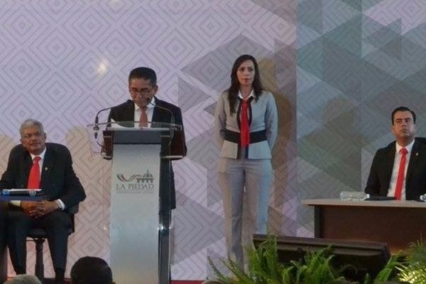 Así tratan de retirar a Ramón Maya Morales del segundo informe de gobierno de JUAN MANUEL ESTRADA MEDINA, en La Piedad, Michoacán.
