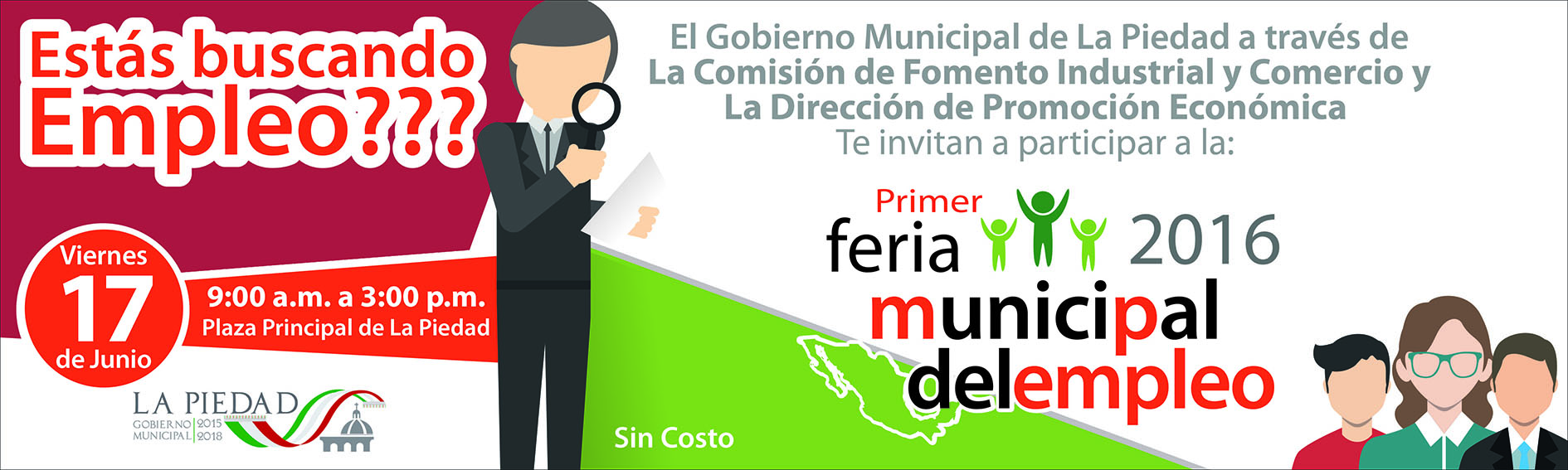 Con la finalidad de alentar al empleo a quienes se encuentran en la búsqueda de la ocupación laboral bien establecida, el Gobierno Municipal de La Piedad 2015-2018 que dirige el Alcalde Juan Manuel Estrada Medina, invita a la población interesada a la “Feria del Empleo Municipal La Piedad 2016” este viernes 17 de junio en la Plaza Principal de La Piedad, con la disposición de 400 vacantes para su ocupación, con el requerimiento de diversas escolaridades de forma incluyente a disposición de la ciudadanía que tenga esta inquietud.